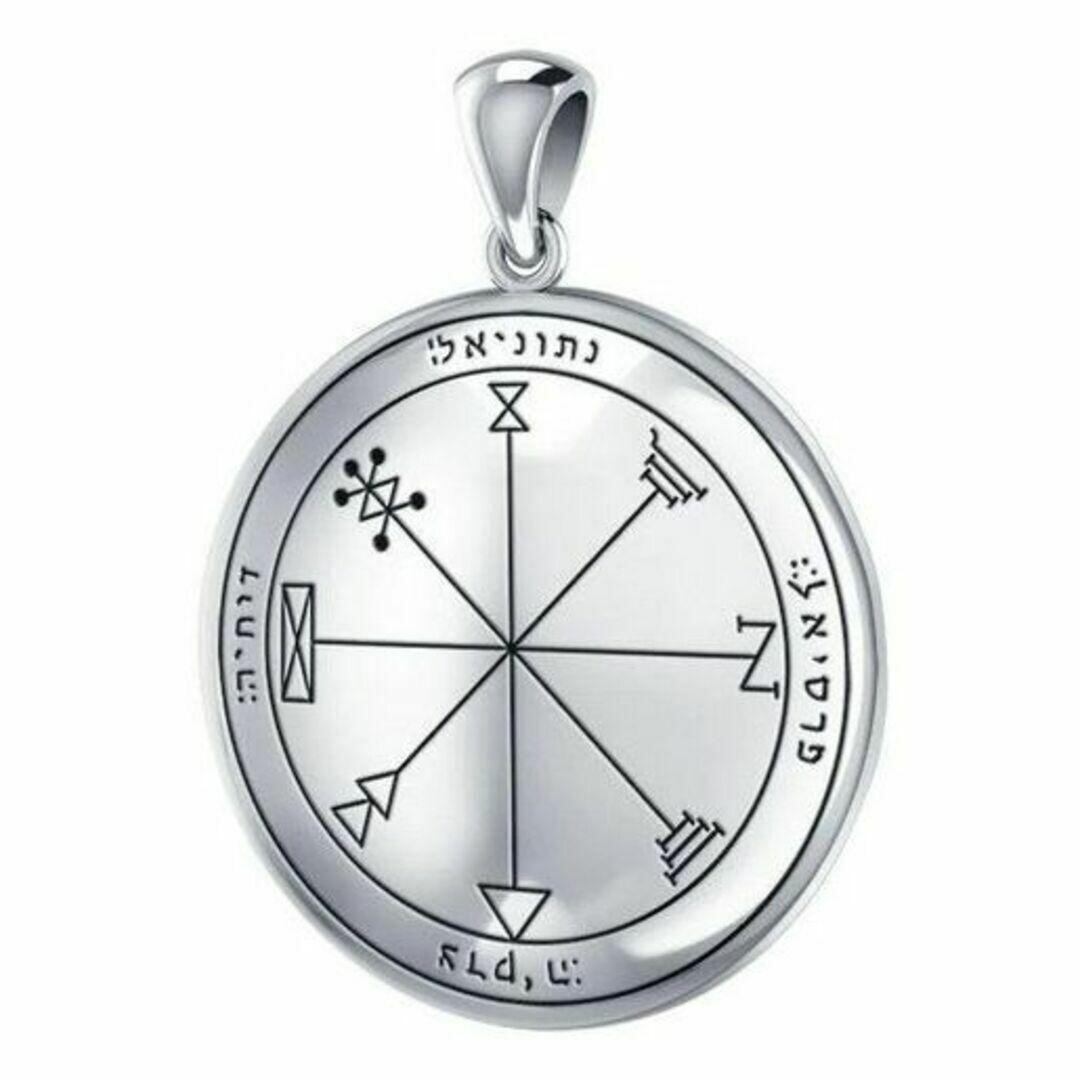 この第 1の木星の五芒星のデザインは、ソロモン王の儀式魔法のグリモワールである「ソロモンの鍵」にあるお守りのデザインの複製です。ヘルメスの錬金術、ローマ占星術、カバラの影響を含むソロモンの魔術は、西洋の難解なオカルトの伝統の基礎となっています。着用者が宝物を見つけ、ビジネスの機会と成功を高めるのに役立つと言われているソロモンのシールの印章です。