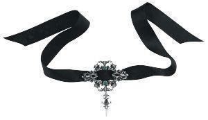 退廃的な富を物語る複雑な頸静脈の飾りは、その下に残る刺激を隠しています。緑のクリスタルがちりばめられ、幅広の黒いリボンに張られた複雑なピューター細工が、真のバロック様式を表現しています。ウィットビー後のルーシー ウェステンラを完成させるのに最適です。
