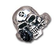 美しいエイジングが施されたゴシックピューターリング、"Alchemy Gothic: デミ アルケミストDemi Alchemist"です。特徴的なデザインは、歯と歯の間に黒薔薇をはさんだドクロをイメージしており、ダークで神秘的な雰囲気を醸し出します。
