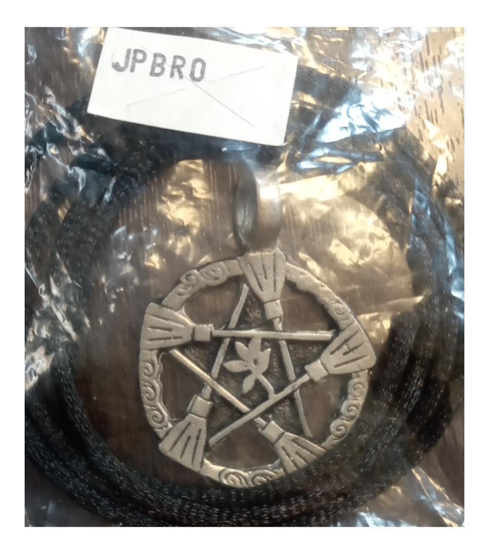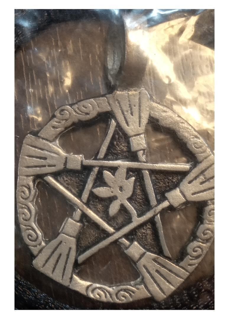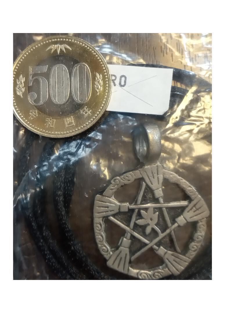 ペンタクル、箒、ニワトコの葉、つる、円の5つのシンボルからなるドルイドのペンタクル。ニワトコはドルイドの時代から神聖視されていた植物で、魔女が最も愛した植物だともされています。円に囲まれたペンタクルは神聖な空間を表し、つるはやはり古代の人々によって神聖視されたブラックベリーの茂みを表しています。ドルイドの技や魔女術を学ぶ人々にとっては、特に素晴らしいアクセサリの一つとなるでしょう。