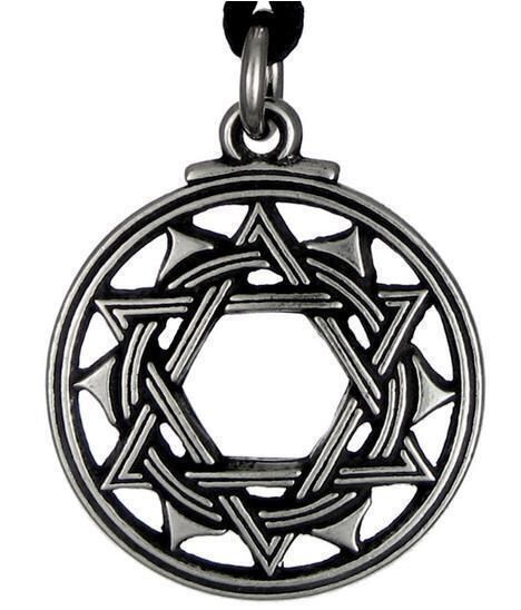 六芒星の周りには絡み合う太陽と月があり、生命そのものの創造と維持に必要な男性と女性のエネルギーを表しています。太陽と星の 12 の点は 12 の黄道帯を象徴しており、地球が太陽の周りを 12 か月かけて一周します。
